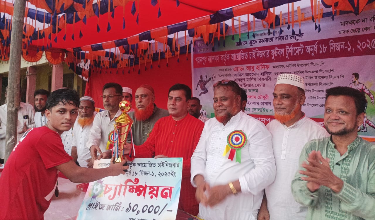 সাইফুল ইসলাম রিয়াদ: “মাদককে না বলি, মাদক ছেড়ে খেলা ধরি, মাদকমুক্ত সমাজ গড়ি” — এই প্রতিপাদ্যকে সামনে রেখে নোয়াখালীর চাটখিল উপজেলার পরানপুর ন্যাশন্স এর আয়োজনে চাইনিজবার ফুটবল টুর্নামেন্টের ফাইনাল খেলা অনুষ্ঠিত হয়েছে।