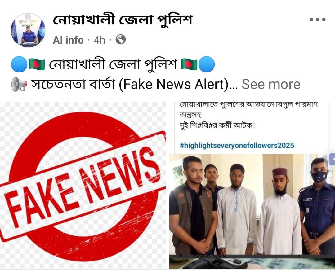 জেলা পুলিশের পক্ষ থেকে জানানো হয়, সম্প্রতি ফেসবুকসহ বিভিন্ন সামাজিক যোগাযোগমাধ্যমে ছড়িয়ে পড়া পোস্টে দাবি করা হয়েছে— “নোয়াখালীতে পুলিশের অভিযানে বিপুল পরিমাণ অস্ত্রসহ দুইজনকে আটক করা হয়েছে।”