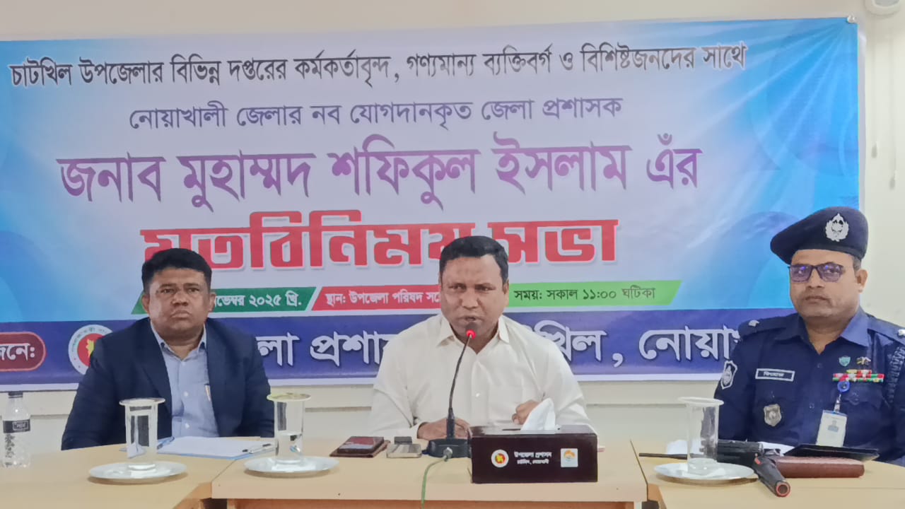 জেলা প্রশাসক মুহাম্মদ শফিকুল ইসলাম তার বক্তব্যে চাটখিলে বিরাজমান বিভিন্ন সমস্যাগুলোর দ্রুত সমাধানের আশ্বাস দেন এবং সকলের সহযোগিতা কামনা করেন।