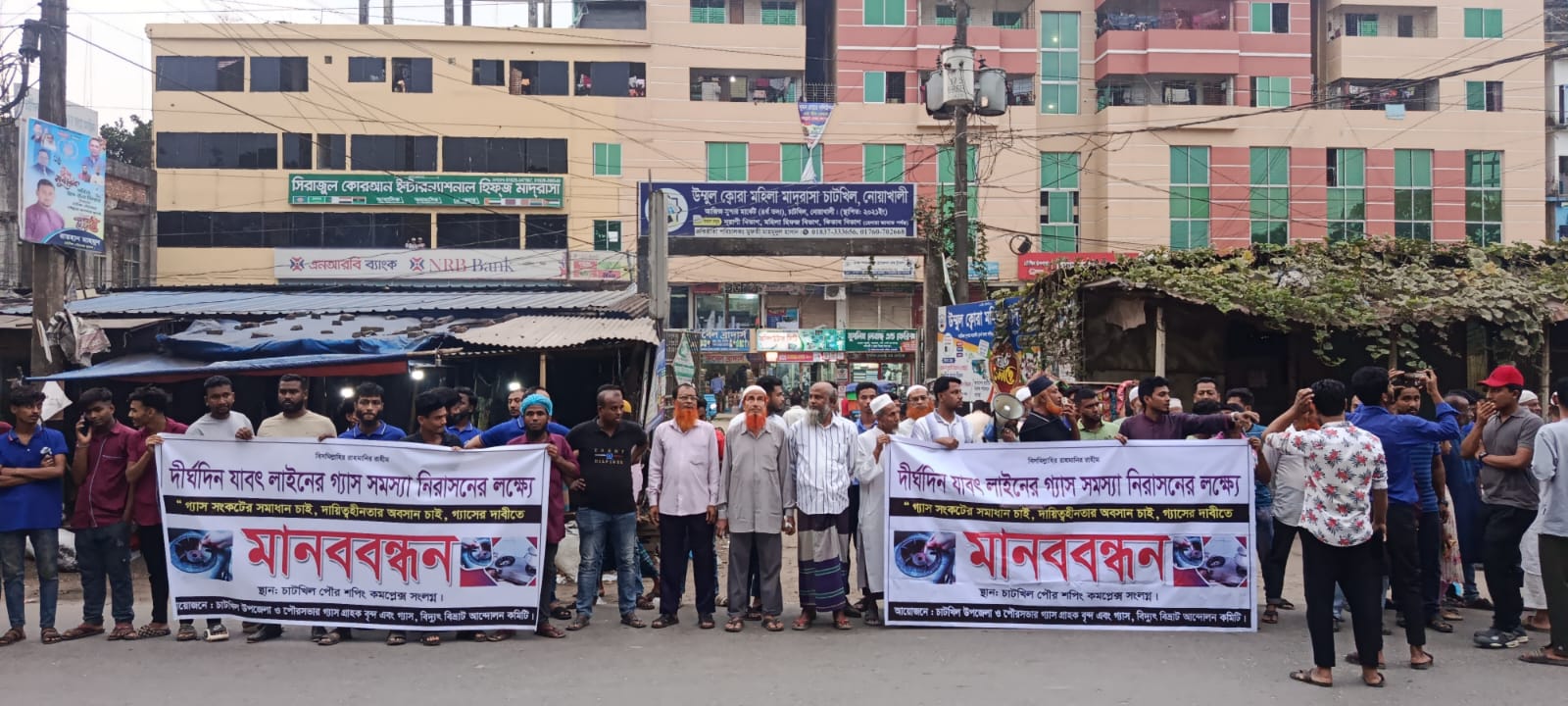 ‘গ্যাস, বিদ্যুৎ বিভ্রাট আন্দোলন কমিটি’ ও চাটখিল পৌরসভার সাধারণ গ্যাস গ্রাহকদের যৌথ উদ্যোগে এই প্রতিবাদ কর্মসূচি পালিত হয়। আন্দোলন কমিটির আহ্বায়ক সোহাগ হোসেনের সভাপতিত্বে অনুষ্ঠিত এই মানববন্ধনে উপজেলার বিভিন্ন শ্রেণি-পেশার শত শত ভুক্তভোগী গ্রাহক ব্যানার ও ফেস্টুন হাতে অংশ নেন।
